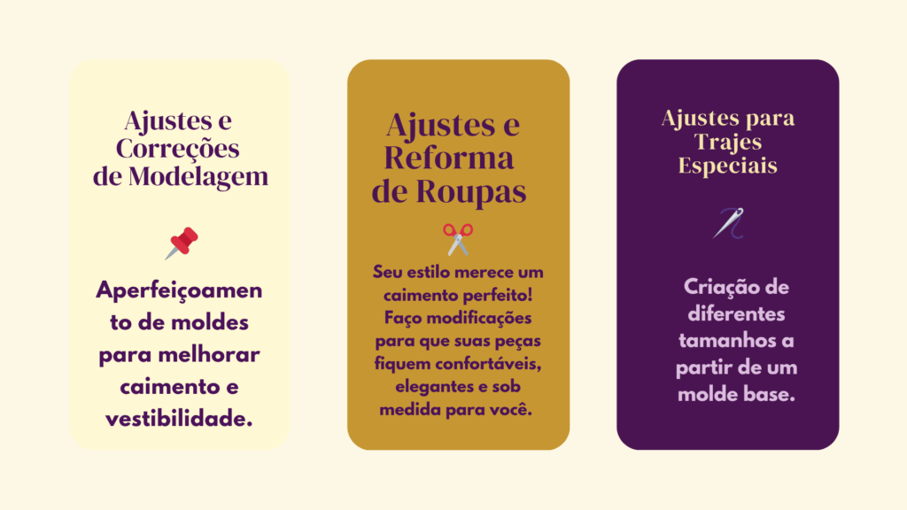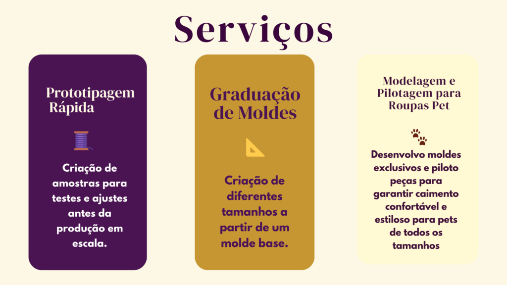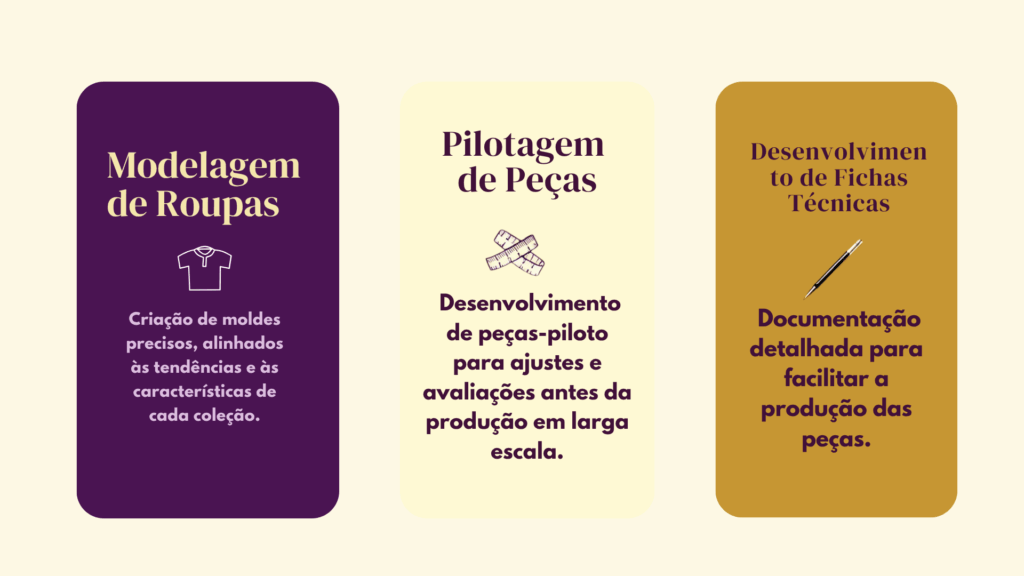 Eu trabalho com modelagem, pilotagem e consultoria técnica em vestuário. Desenvolvo moldes, confecciono peças-piloto e ajudo estilistas e marcas a transformarem suas ideias em produtos reais.